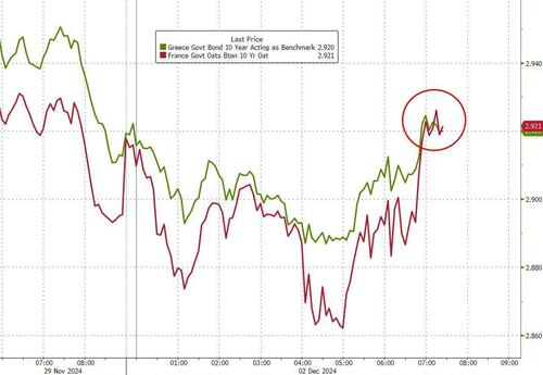 除了特朗普关税,周一令欧元风声鹤唳的法国政坛动荡,也可能为美元多头在年底提供新的助力。由于与极右翼“国民联盟”的财政案磋商谈崩,法国总理米歇尔·巴尼耶周一宣布,将动用宪法49.3条强行通过预算。与此同时,法国左翼联盟“新人民阵线”和极右翼“国民联盟”均确认将支持对巴尼耶的不信任投票,两方联合足以推翻巴尼耶政府。