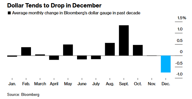 在过去10次12月行情中,彭博美元指数有8次出现下跌,这通常是因为美元在年底往往会成为投资组合再平衡流动和所谓“圣诞老人行情”的受害者,这将鼓励交易员抛售美元,换取股票等风险较高的资产。