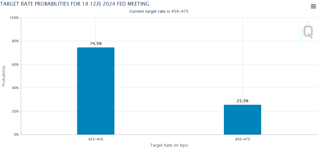 芝商所的美联储观察工具显示,在沃勒周一发表支持12月降息的讲话后,利率期货市场交易员预计美联储本月降息的概率已达到了75%,较两周前的约五成继续大幅攀升。
